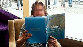 [ο ίδιος άπλυτος-φαίνεται στο μαλλί το λιγδιασμένο και το αχτένιστο- «δημοσιογράφος» κάνει τον φιλότεχνο, διαβάζοντας(;) βιβλίο για τον Monet(πιθανόν με ένα PLAYBOY ή άλλο πορνοπεριοδικό μέσα). Δηλ. δεν πρόκειται να τον αναγνωρίσουν οι Ιταλοί δημοσιογράφοι μετά το ρεζιλίκι και στο ξενοδοχείο της Εθνικής; Αποκλείεται!!!]